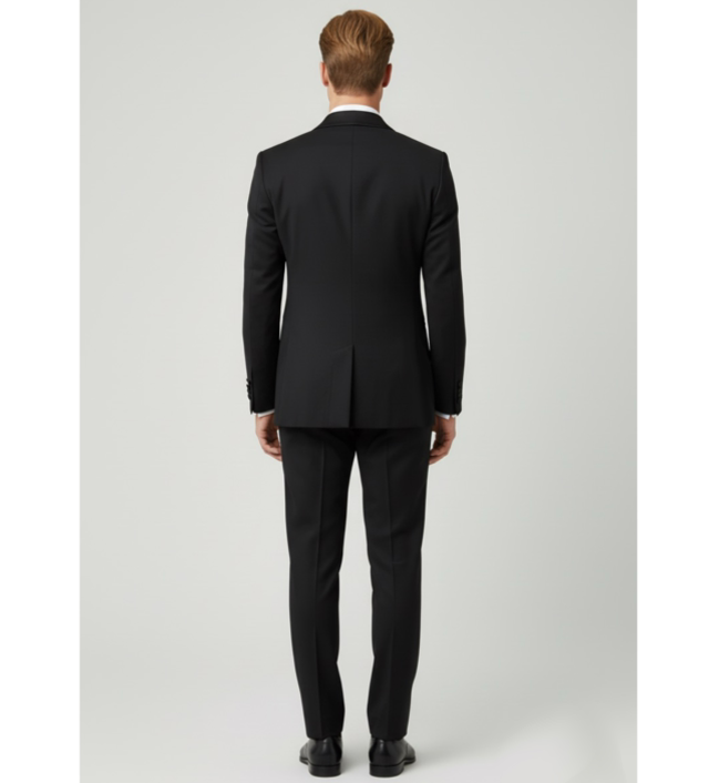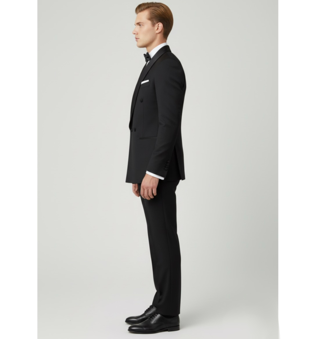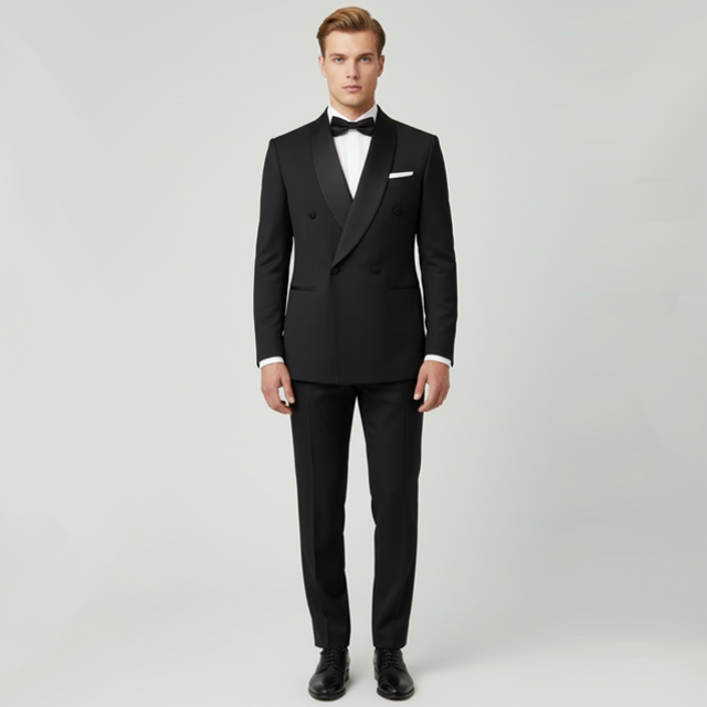 Abito smoking con dettagli in raso , riservato a eventi formali come galá o matrimoni.