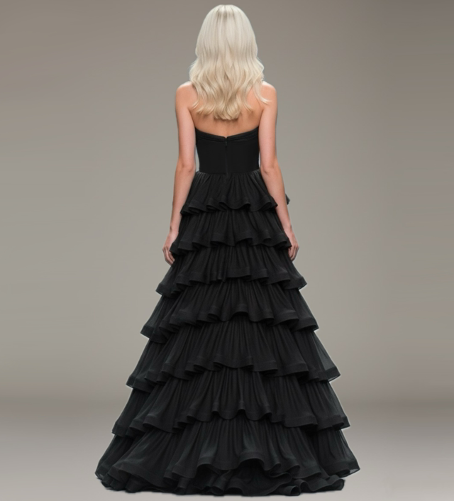 Abito in tessuto di raso e organza a balze nero.