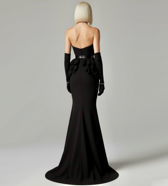 Abito con bustier e base in crepe cadì in seta nero.